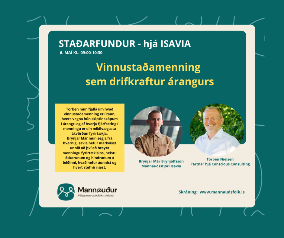 Þá segir Brynjar Már Brynjólfsson, mannauðsstjóri Isavia, frá hvernig Isavia hefur markvisst unnið að því að breyta menningu fyrirtækisins, helstu áskorunum og hindrunum á leiðinni, hvað hefur áunnist og hvert stefnir næst. Sérstök áhersla verður á þá drifkrafta sem hafa gert breytingarnar mögulegar.